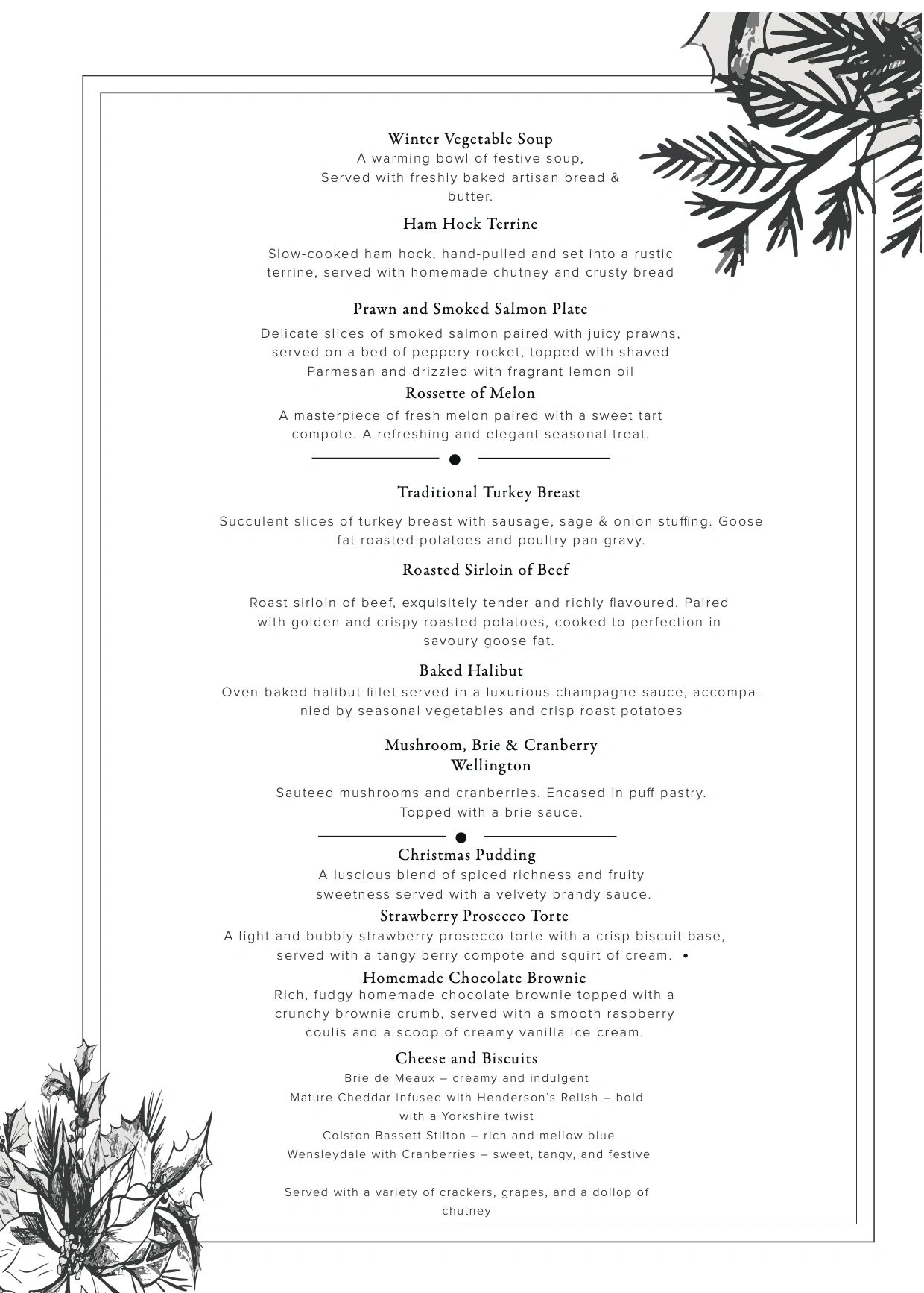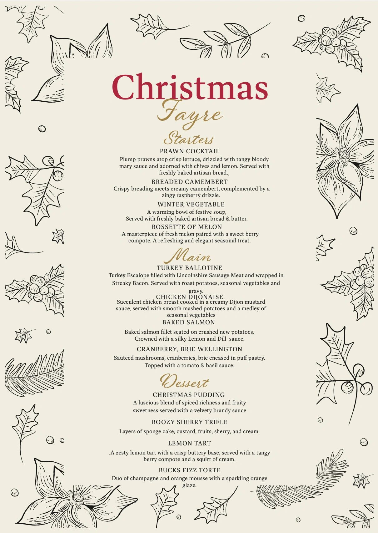 From succulent Turkey Ballotine and Baked Salmon to creamy Camembert, Winter Vegetable Soup, and irresistible festive desserts like Bucks Fizz Torte and Boozy Sherry Trifle, we’ve created a menu to please every palate — including vegetarian, vegan, and gluten-free options.