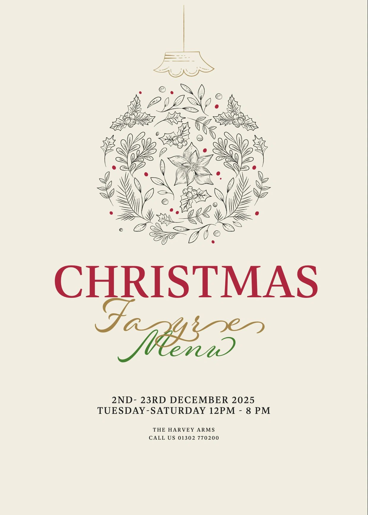 Step into the warmth of the season and celebrate with our Christmas Fayre Menu at The Harvey Arms — a festive dining experience full of flavour, charm, and classic Christmas spirit.